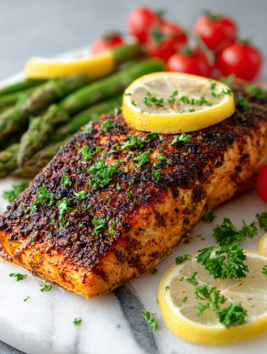 Let the salmon rest for 2 minutes after cooking. Squeeze fresh lemon juice on top for brightness. Serve immediately with sides to balance the smoky, spicy crust.