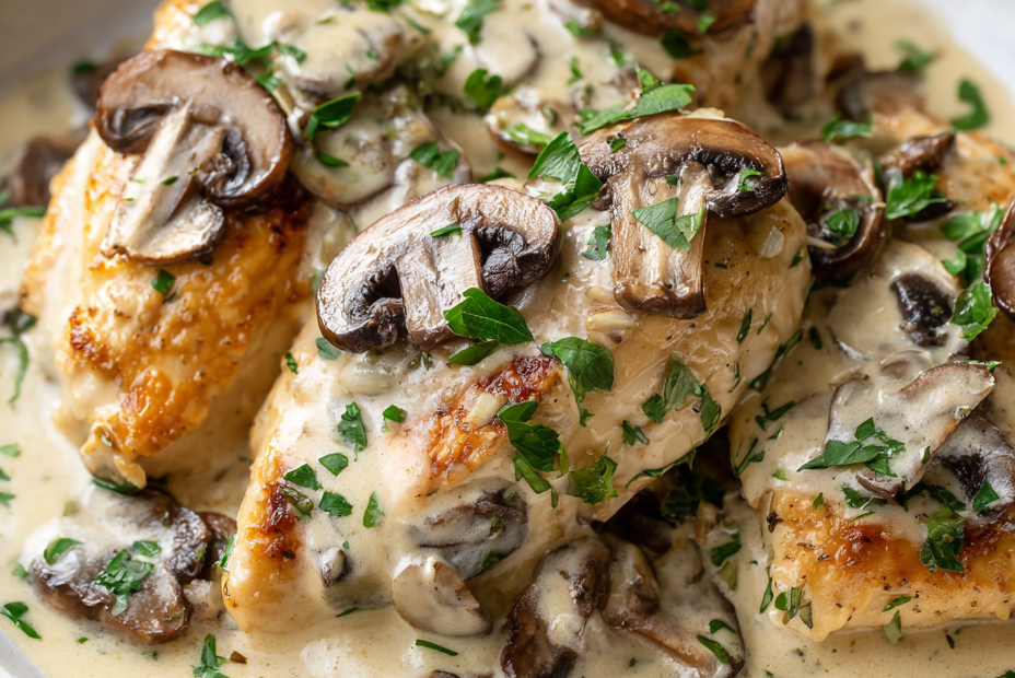 This comforting dish features tender, skinless chicken breasts seared to golden perfection, topped with a rich, velvety mushroom cream sauce. The sauce is made from sautéed mushrooms, garlic, and heavy cream, creating a smooth, luxurious texture that coats the chicken beautifully. Perfect for a cozy family dinner or an elegant weeknight meal, it combines simple ingredients with classic techniques for a satisfying plate.
