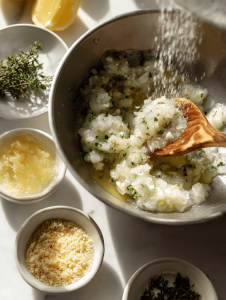 Step 2: Mix ground meat with finely chopped eyeballs, garlic, and herbs until just combined.