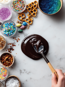 - While the chocolate is still warm, sprinkle your chosen toppings—candy pieces, pretzels, sprinkles—gently pressing them into the surface to ensure they stick.