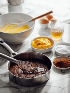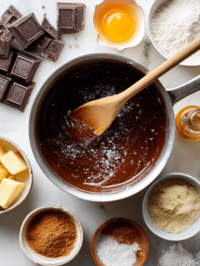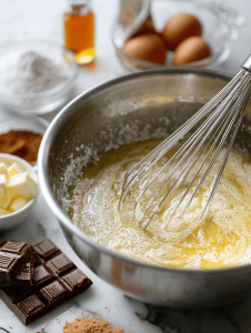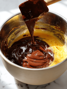 - Pour the melted chocolate mixture into the egg and sugar mixture, stirring gently until fully combined and smooth.