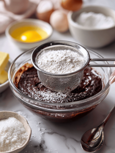 - Fold in the flour until just incorporated, being careful not to overmix, which keeps the brownies tender.