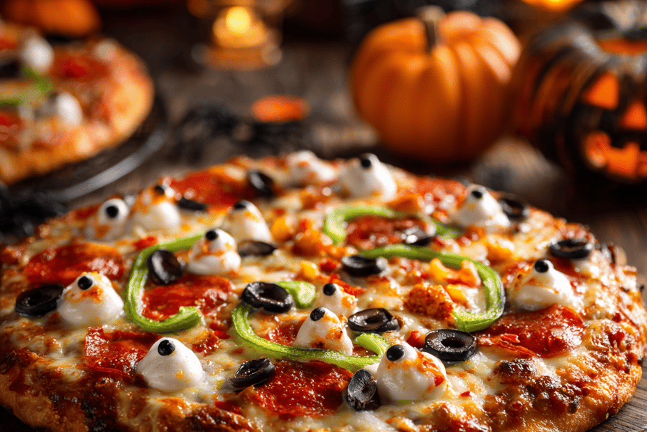 - Arrange black olives into spooky eyes or mouths, and place sliced bell peppers or pepperoni to create faces or fun shapes.