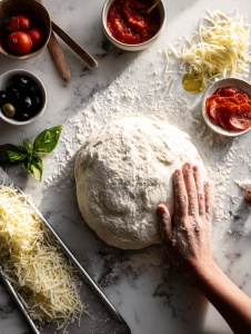 - Pizza dough: The base, needs to be thin and slightly uneven for crusty edges.