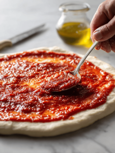 - Spread a thin layer of tomato sauce evenly over the dough, leaving a small border around the edges for a crust.