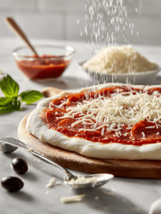 - Sprinkle the shredded mozzarella generously over the sauce, covering the entire surface for gooey, bubbly cheese.