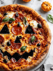 - Slice the pizza into pieces, revealing the vibrant, festive toppings and crispy edges, then serve and enjoy your spooky creation!