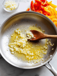 - In a skillet, heat the olive oil over medium heat. Add chopped onions and minced garlic; sauté until fragrant and translucent, about 5 minutes, until they soften and become aromatic.
