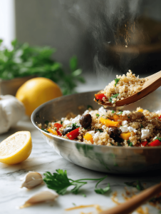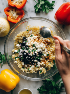 Step 4: Mix cooked rice, ground meat, sautéed veggies, and spices in a bowl. Stuff the peppers generously.