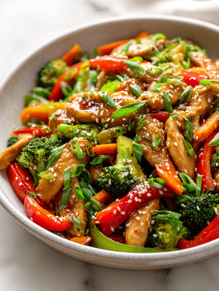 This chicken stir fry features tender, thinly sliced chicken cooked quickly in a hot pan, combined with crisp-tender vegetables and a glossy, savory sauce. The dish showcases a balance of textures and vibrant flavors, finished with aromatic soy, garlic, and sesame oil for a satisfying, weeknight-friendly meal.