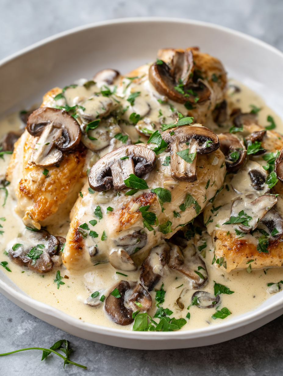 - Transfer the chicken to plates, spoon generous amounts of mushroom sauce over each piece, and garnish with fresh herbs if desired. Serve immediately for best flavor and texture.