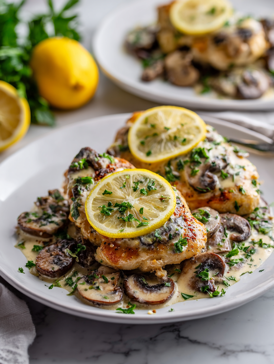 This dish features tender chicken breasts seared to a golden crisp, nestled in a rich mushroom and cream sauce. Sautéed cremini mushrooms absorb the luscious sauce, which is brightened with a splash of fresh lemon at the end, resulting in a comforting yet lively main course with a velvety texture and vibrant flavor contrast.