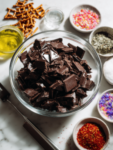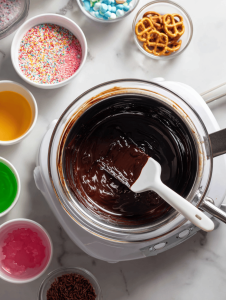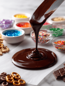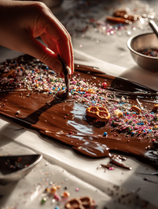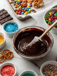 - While the chocolate is still warm, sprinkle your chosen toppings—candy pieces, pretzels, sprinkles—gently pressing them into the surface to ensure they stick.