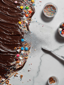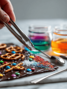 Step 4: While still warm, sprinkle your chosen toppings—think crushed candy, pretzels, or edible glitter—over the surface.