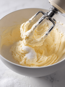 - In a large mixing bowl, cream together the softened butter and sugar using an electric mixer or whisk until the mixture is light, fluffy, and slightly pale, about 3-4 minutes. The sound should be a gentle whir, and the mixture should look smooth.