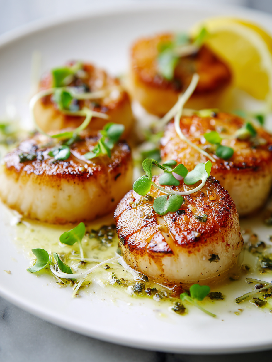 Transfer scallops to a warm plate. Rest for 1-2 minutes. Finish with lemon squeeze and herbs. Serve immediately for best texture and flavor.