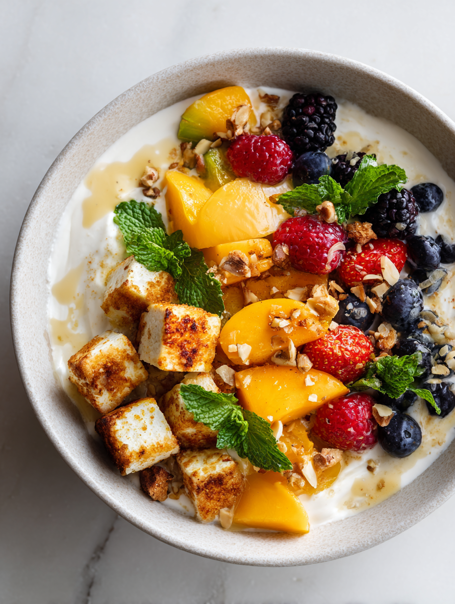 - Assemble the bowl: Spoon the seasoned yogurt into a serving dish. Top with the warm, crispy paneer cubes. Add fresh toppings like chopped herbs, sliced fruits, or nuts as desired.