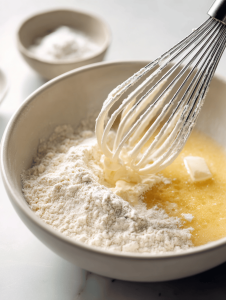 3. Add the flour to the melted butter and whisk vigorously for about 1 minute, until the mixture turns a light golden color and feels slightly thickened.