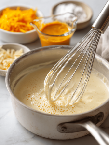 4. Gradually pour in the milk while whisking constantly, creating a smooth sauce. Continue whisking until the mixture thickens slightly and starts to bubble, about 3-5 minutes.