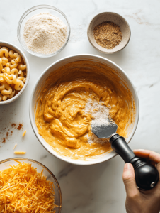 7. Season the sauce with salt and pepper to taste, then fold in the cooked macaroni until evenly coated with the pumpkin cheese sauce.