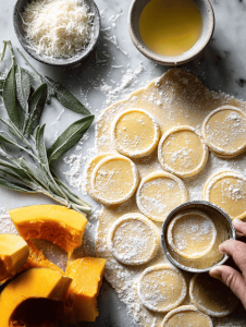 - While the pumpkin cools, roll out your pasta dough on a floured surface until very thin—about 1-2 mm thick. Use a small circle cutter or knife to cut out uniform shapes, about 3 inches in diameter.