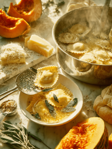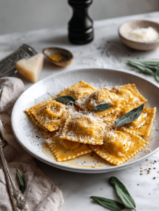 Step 10: Toss the cooked ravioli in the sage butter, then serve immediately, topped with grated Parmesan.