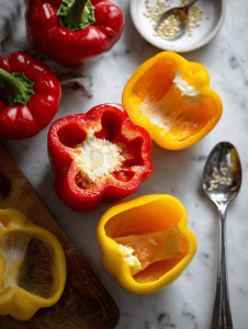 - Slice off the tops of the bell peppers and carefully remove the seeds and membranes with a spoon or knife, creating hollow vessels.