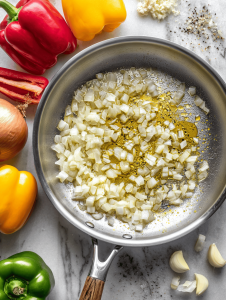 - In a skillet, heat the olive oil over medium heat. Add chopped onions and minced garlic; sauté until fragrant and translucent, about 5 minutes, until they soften and become aromatic.
